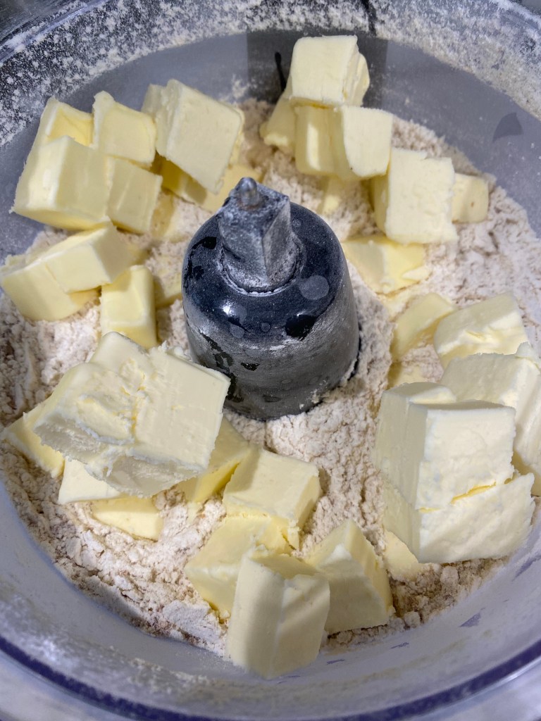 - Add 14 tablespoons of cold butter cut into cubes and pulse until it resembles sand.