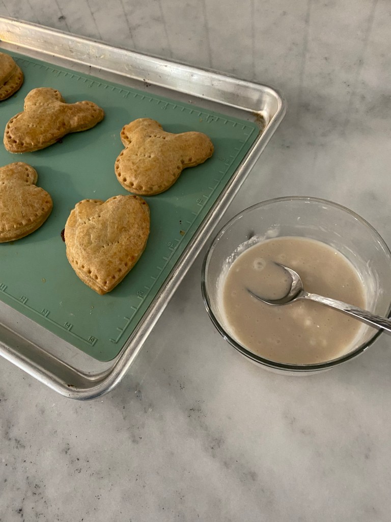 - Crimp edges with a fork and poke holes in the center of each pastry to allow steam to escape. Then brush with egg wash ( 1 egg beaten with 2 tablespoons of water).