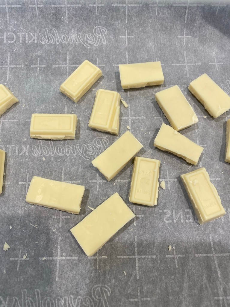 - Line a baking sheet with parchment paper and put the white chocolate on it in several pieces. Place in the oven for 10 minutes.