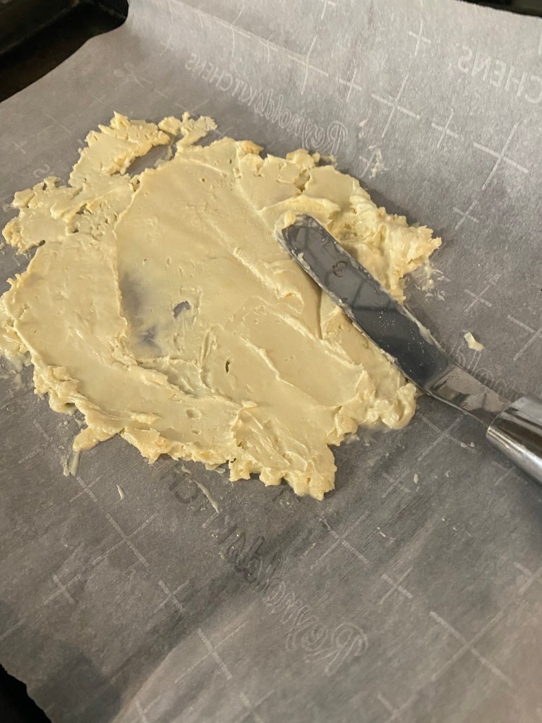 - Remove and spread white chocolate again, it will be lumpy but you will be able to smooth it out. Repeat the 5 minute intervals until the white chocolate is golden in color.