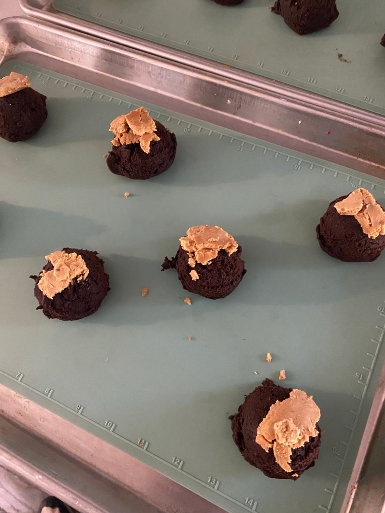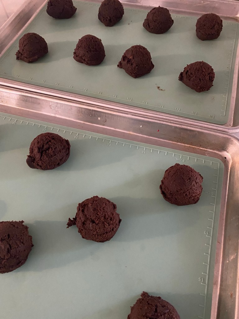 - On two lined baking sheets place 1/4 cup balls of dough, approximately 12, spaced evenly on each sheet.