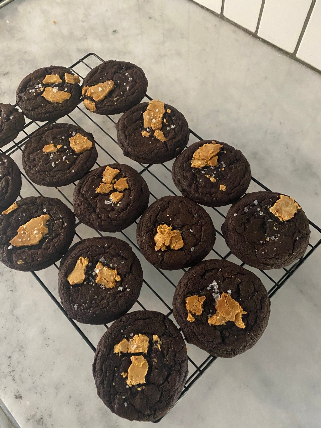 This is a subtle chocolate sugar cookie topped with a nutty caramelized white chocolate crumble and flaky sea salt.