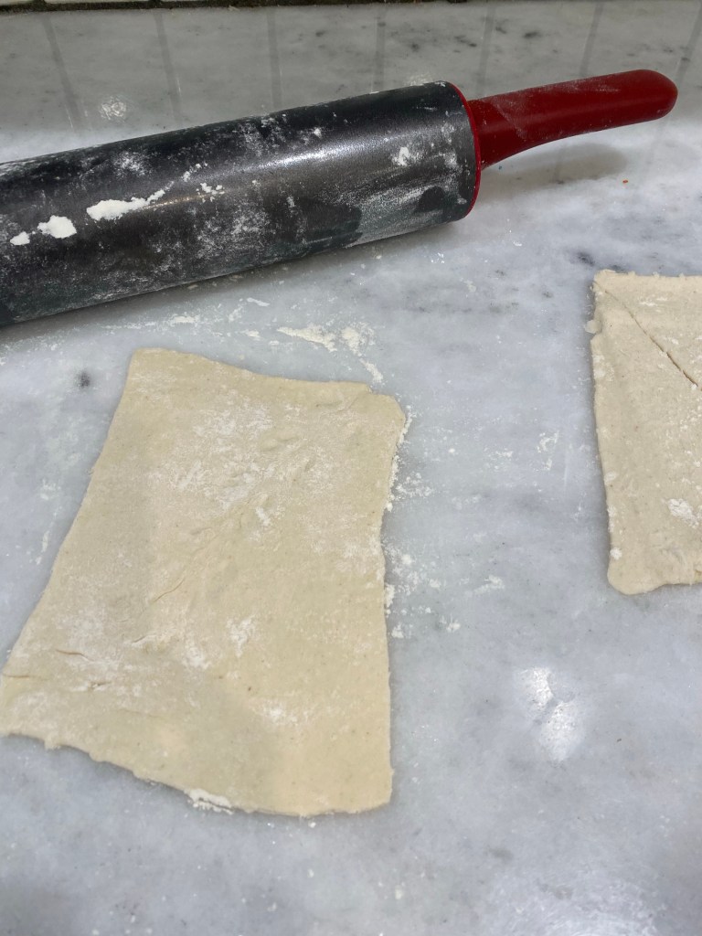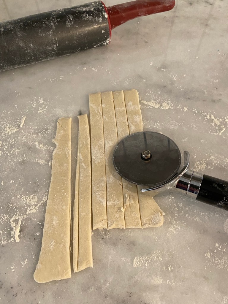 - Take refrigerated crescent roll dough out of the refrigerator and roll out on a lightly floured surface. Roll with a lightly floured rolling pin to slightly enlarge the dough. Cut with a pizza cutter into strips.