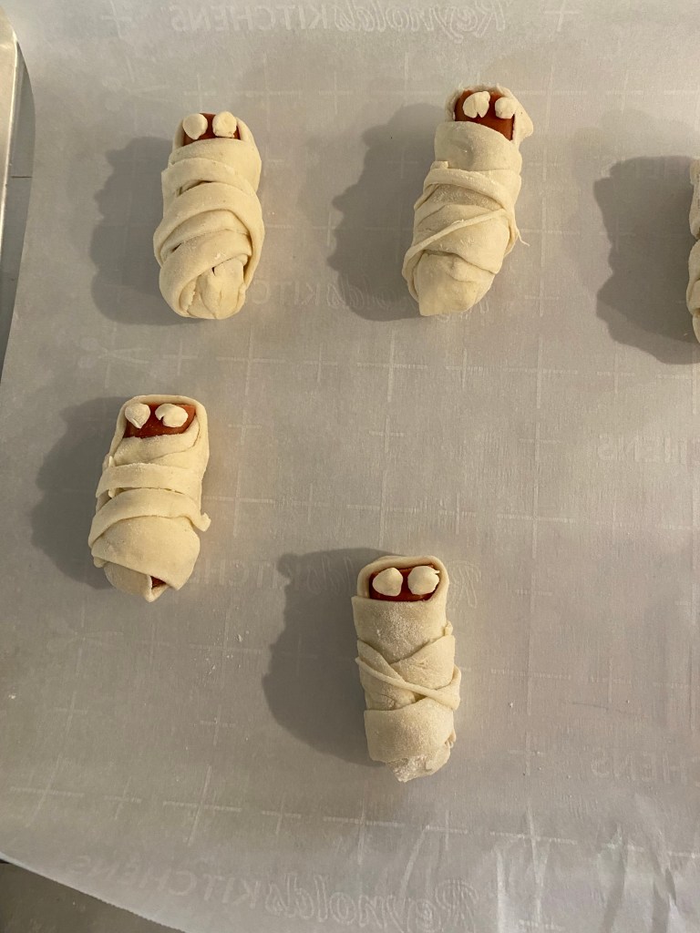 - Wrap around each hot dog and bake at 375 degrees F on a parchment lined baking sheet for 12-15 minutes.