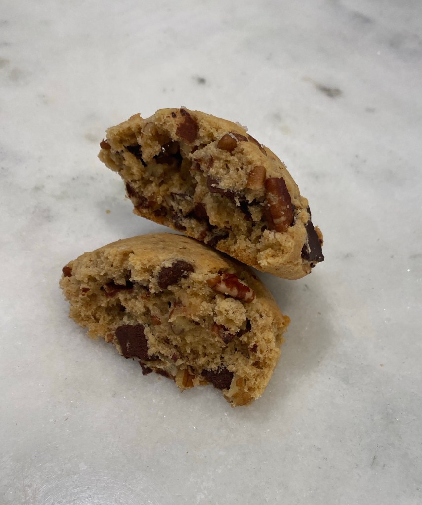 These delicious cookies have a crisp outside with a soft interior. The bourbon and pecans really complement each other and pair perfectly with the chocolate chips.