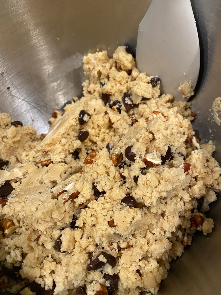 - Add dry mixture to wet ingredients and mix until combined. Add chocolate chunks and pecans until incorporated.