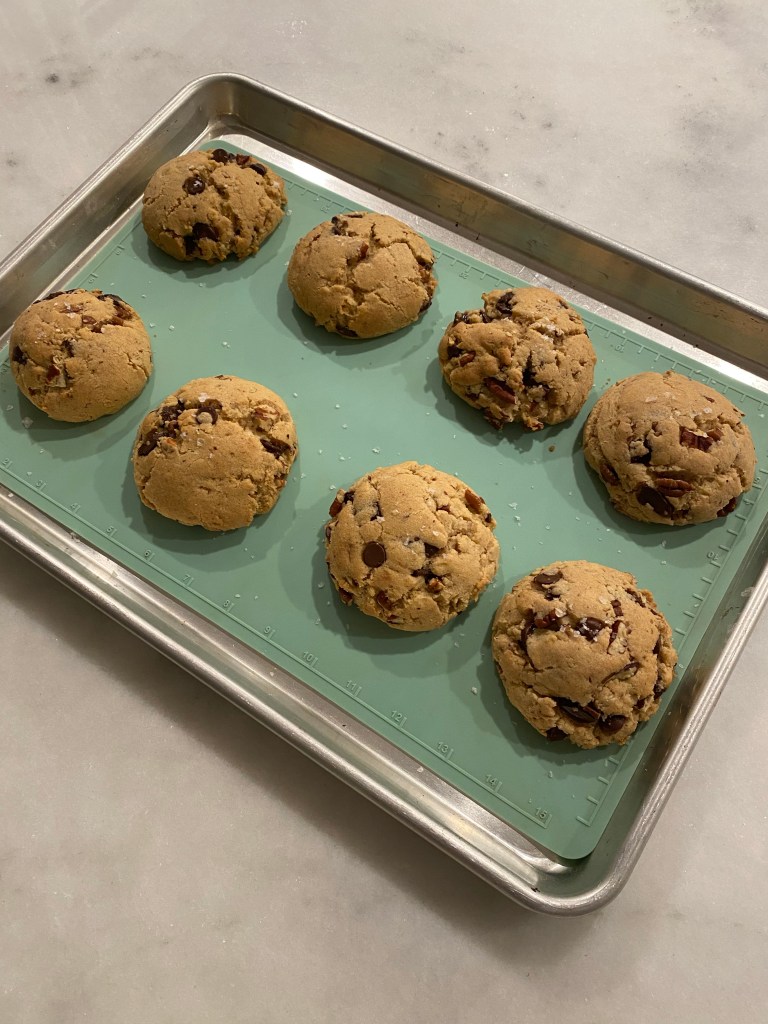 - Chill dough for 1-2 hours. Remove from refrigerator and portion into 1/4 cup balls and place two inches apart on parchment lined baking sheets. Top each cookie with flaky sea salt.