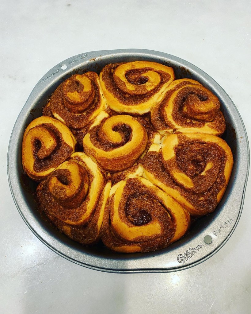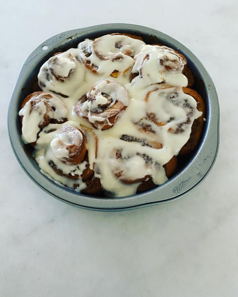Nothing better than warm cinnamon rolls. And these are topped with delicious cream cheese icing. Pair with a cup of coffee for a perfect treat.