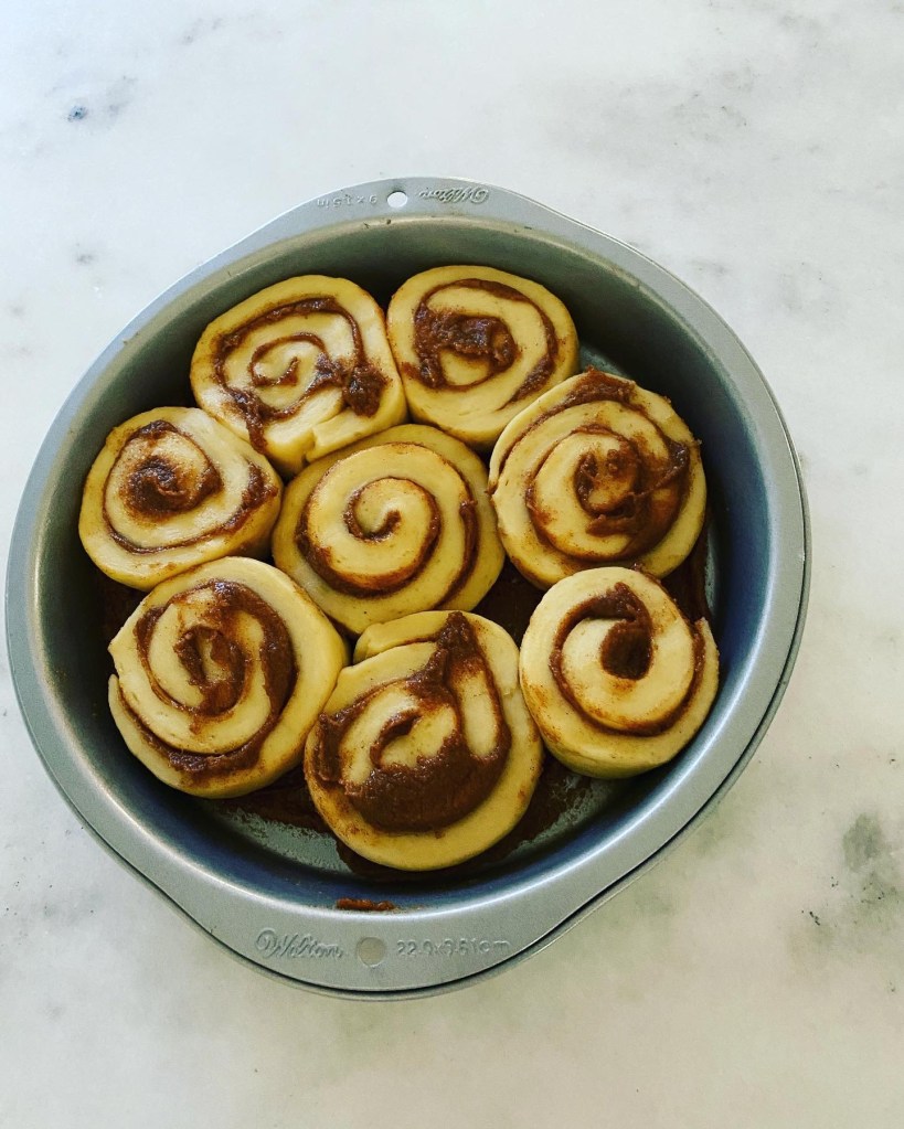 - After the dough has risen butter two 9 inch cake pans and set aside.